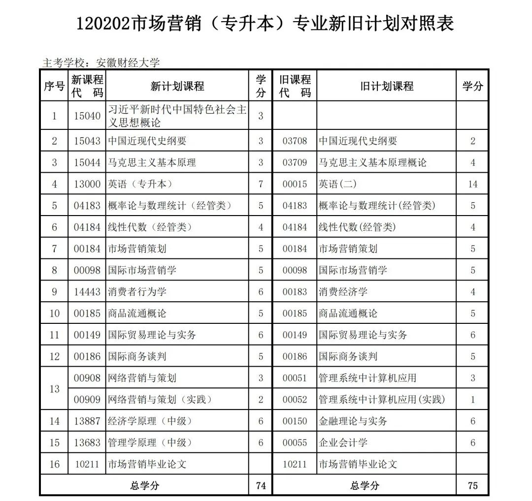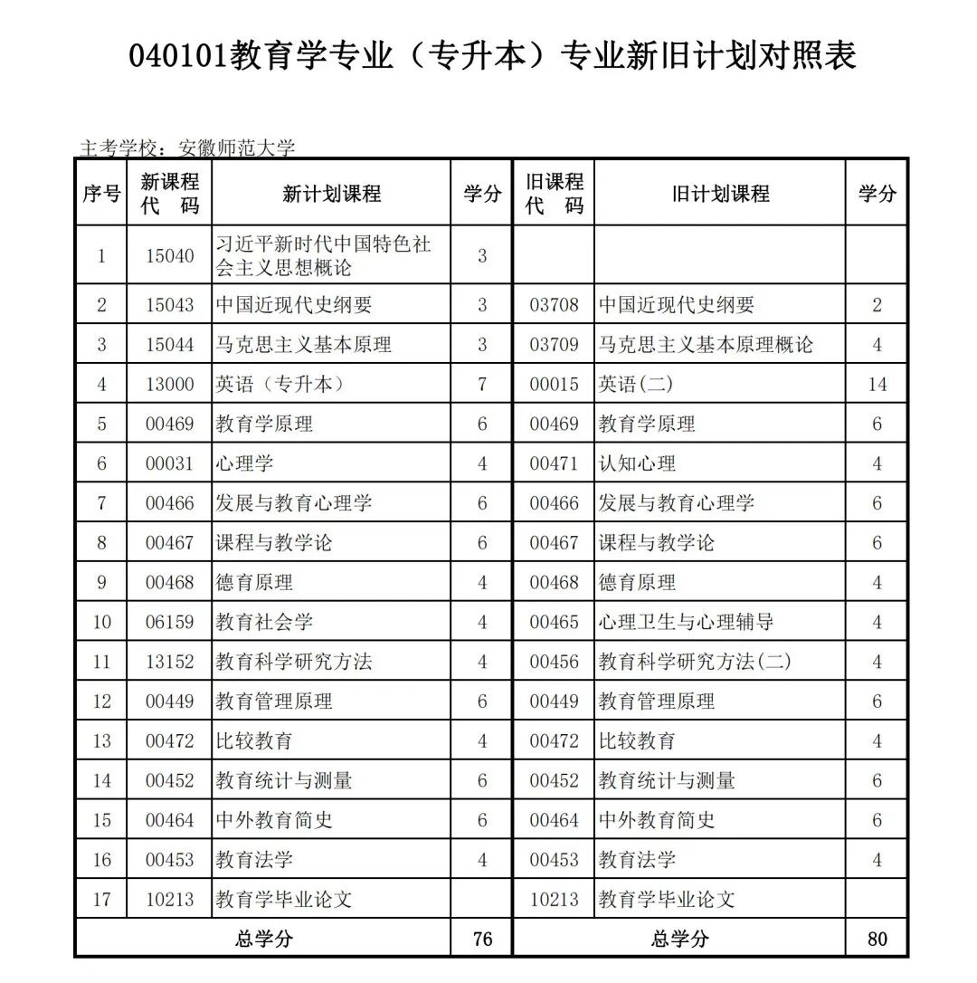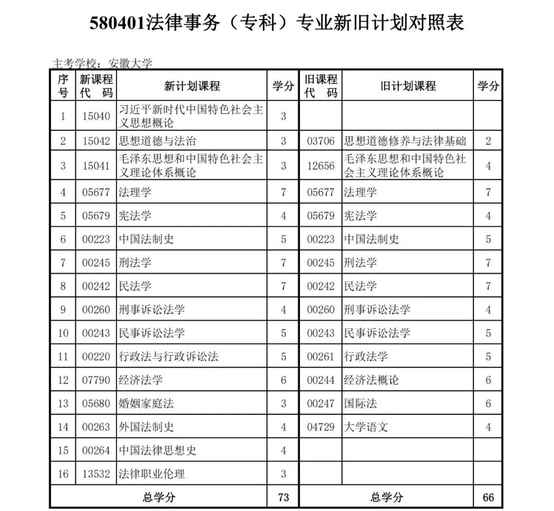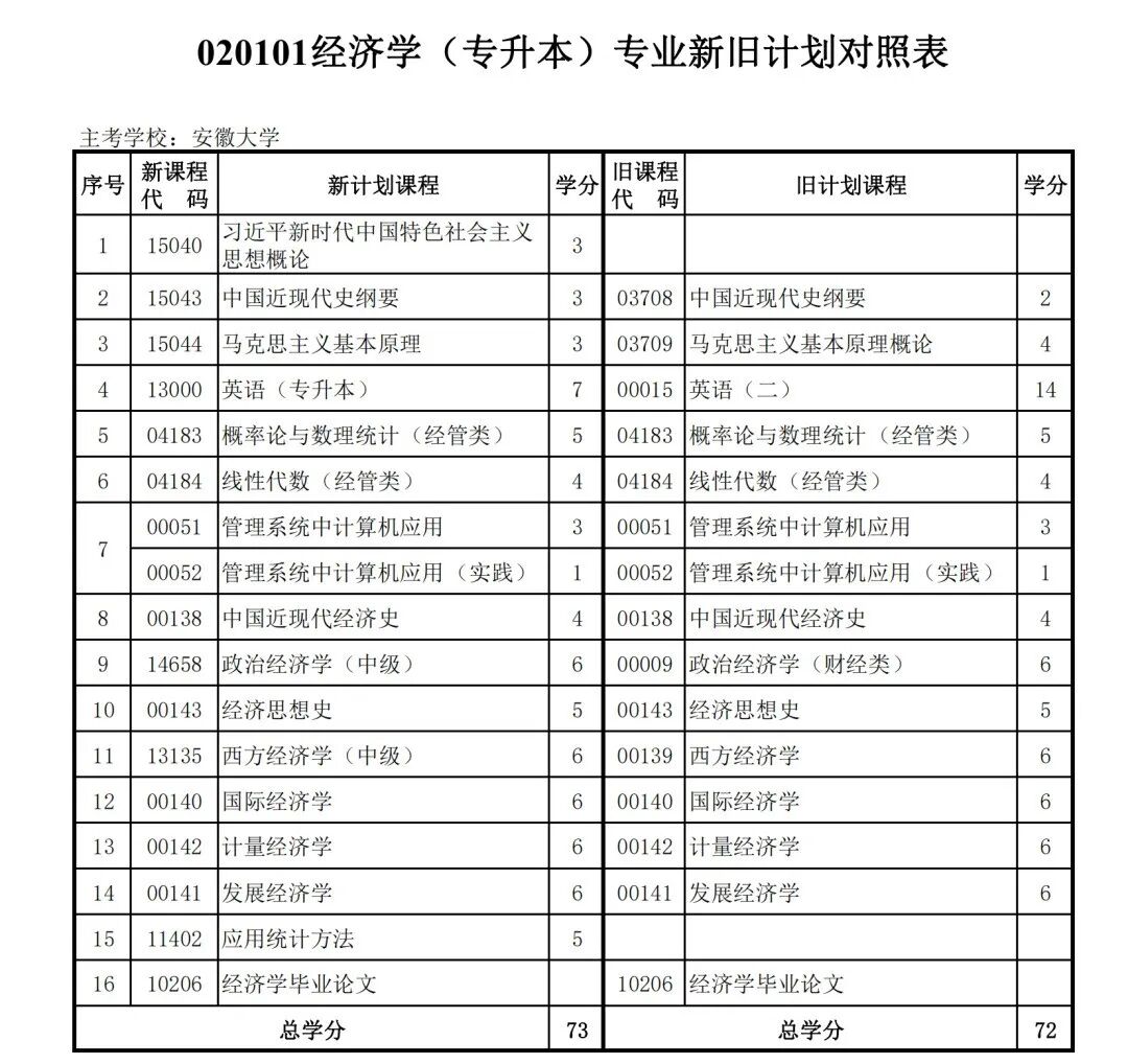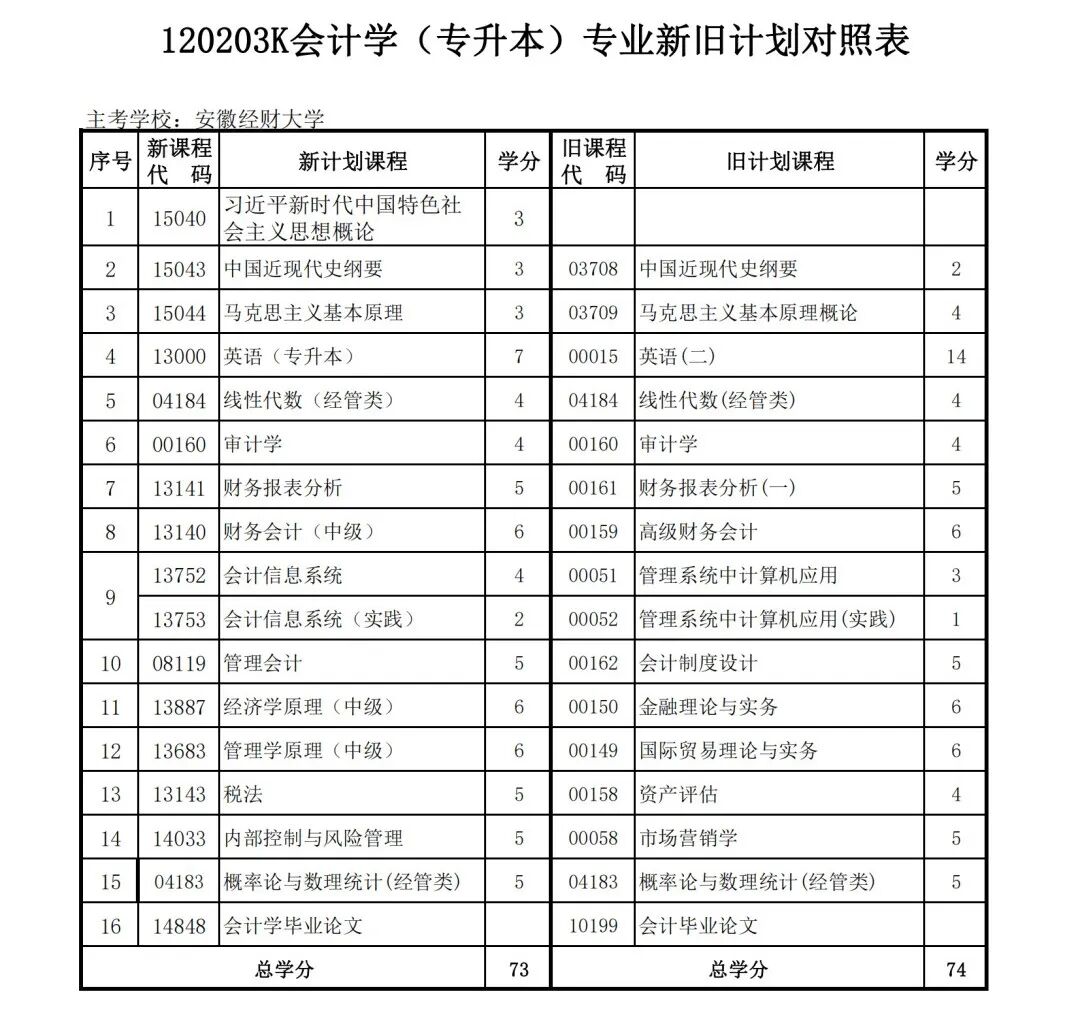 安徽省自学考试新旧考试计划对照表2026版