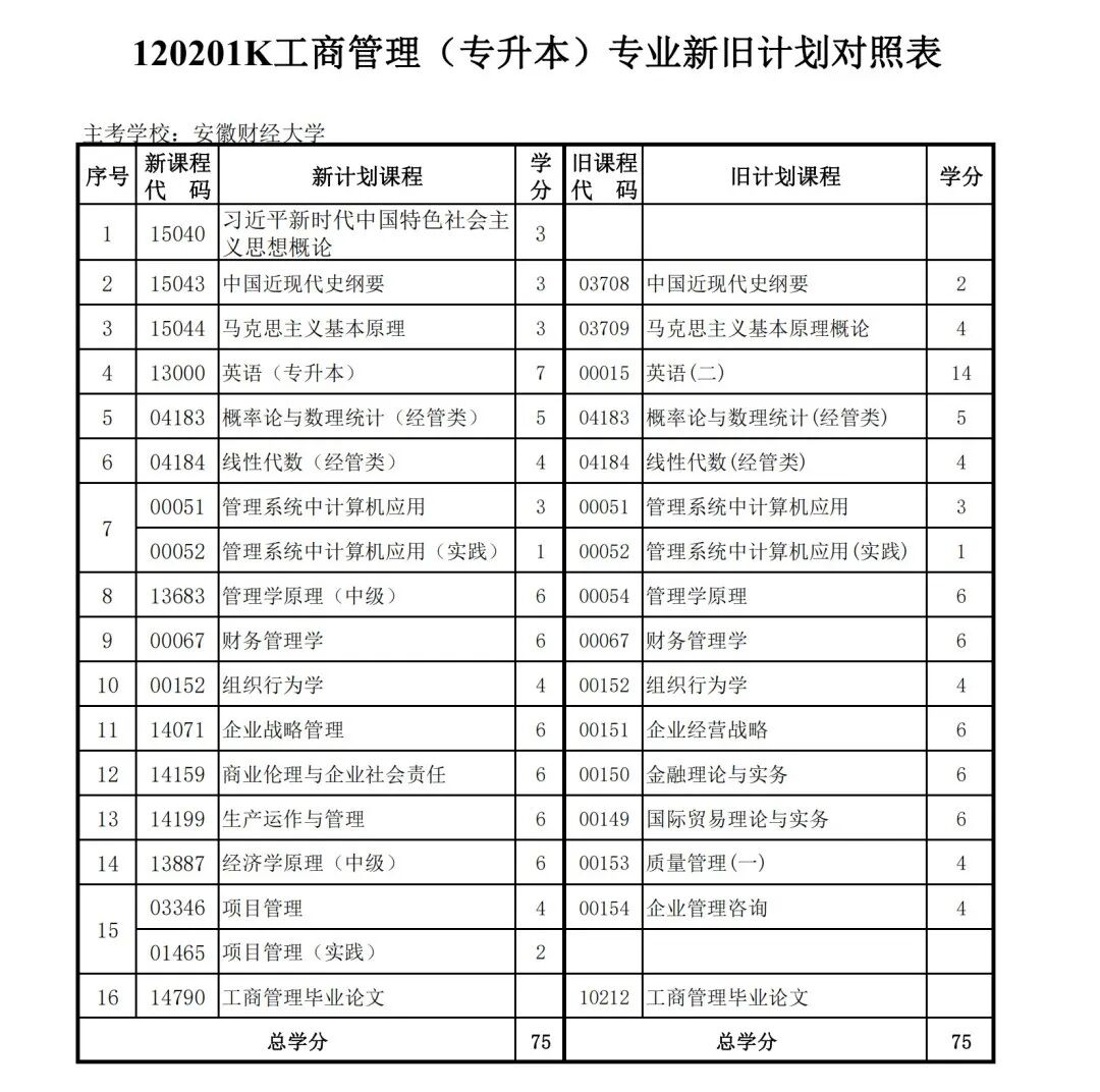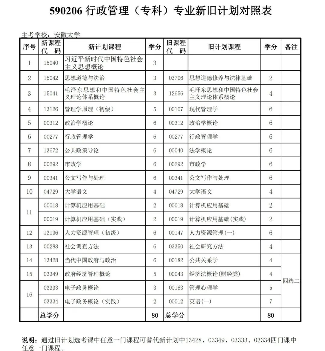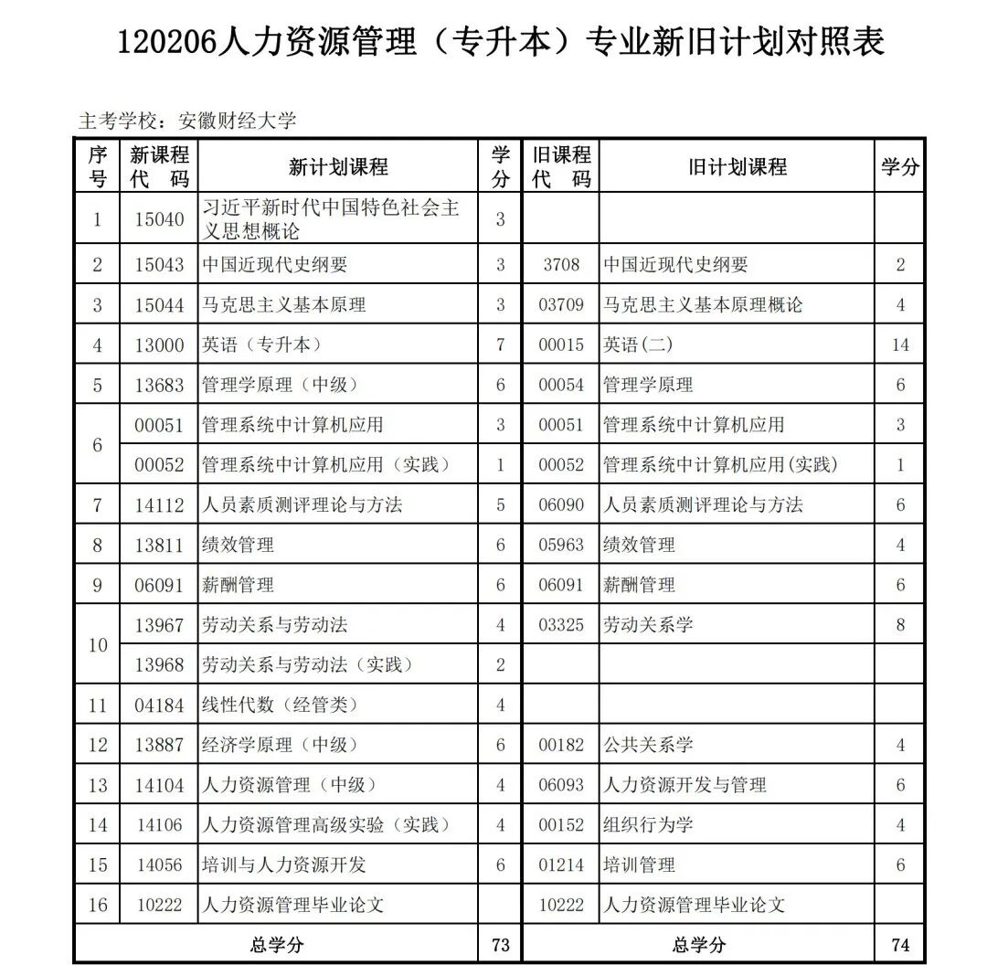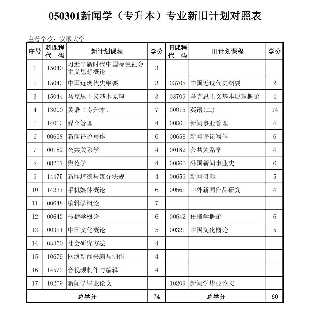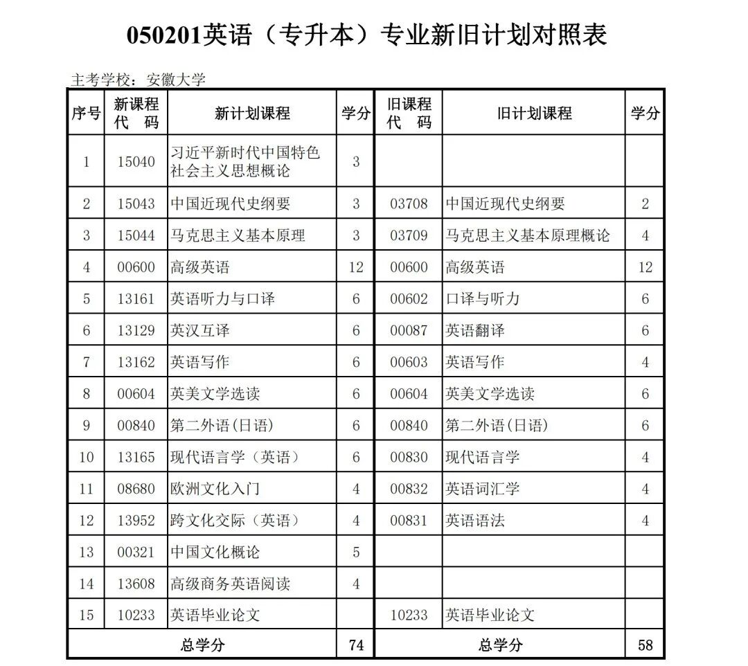 安徽省自学考试新旧考试计划对照表2026版