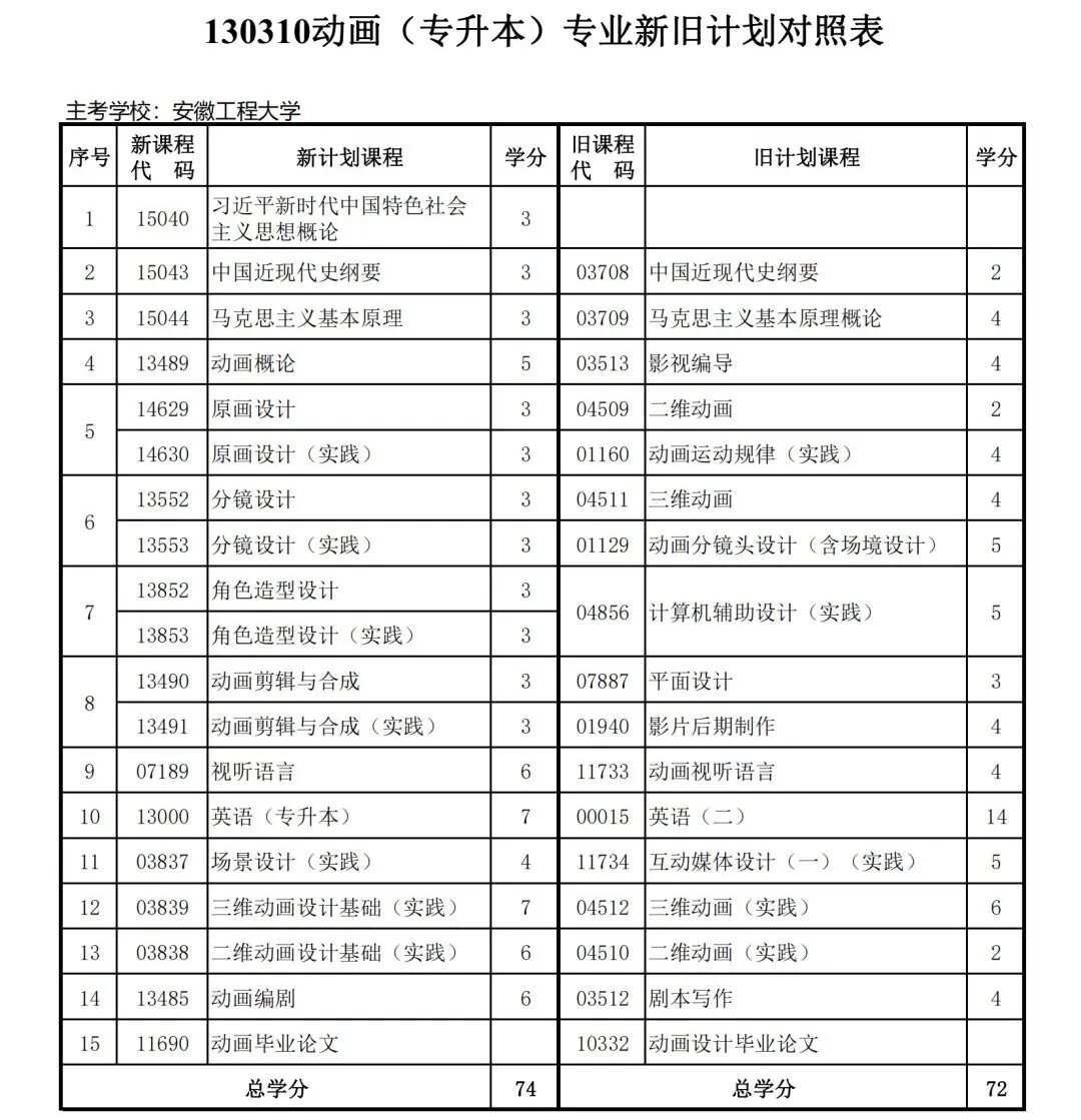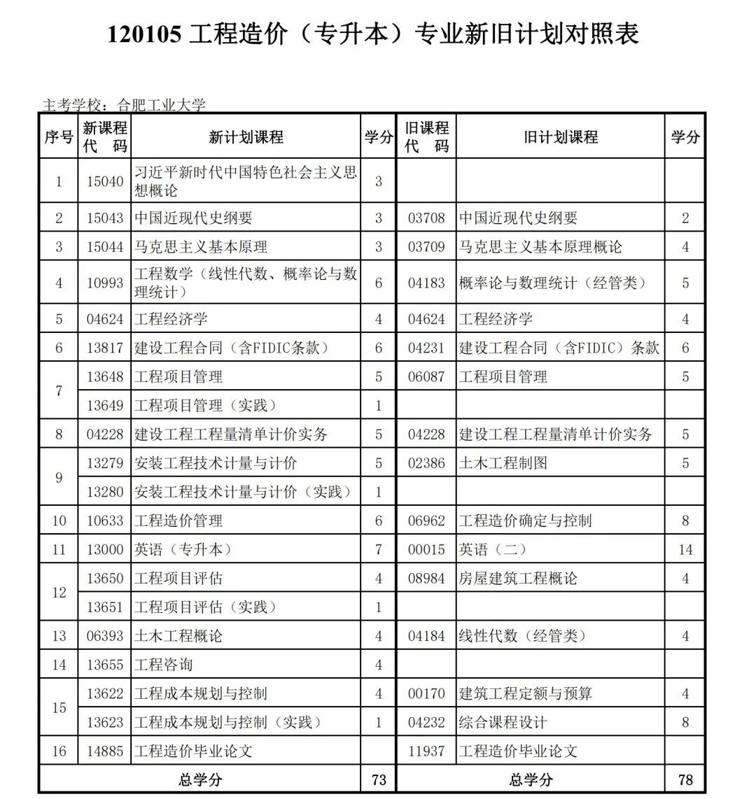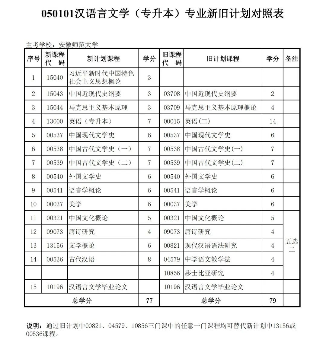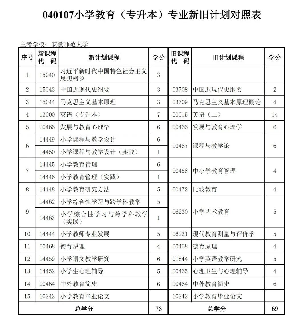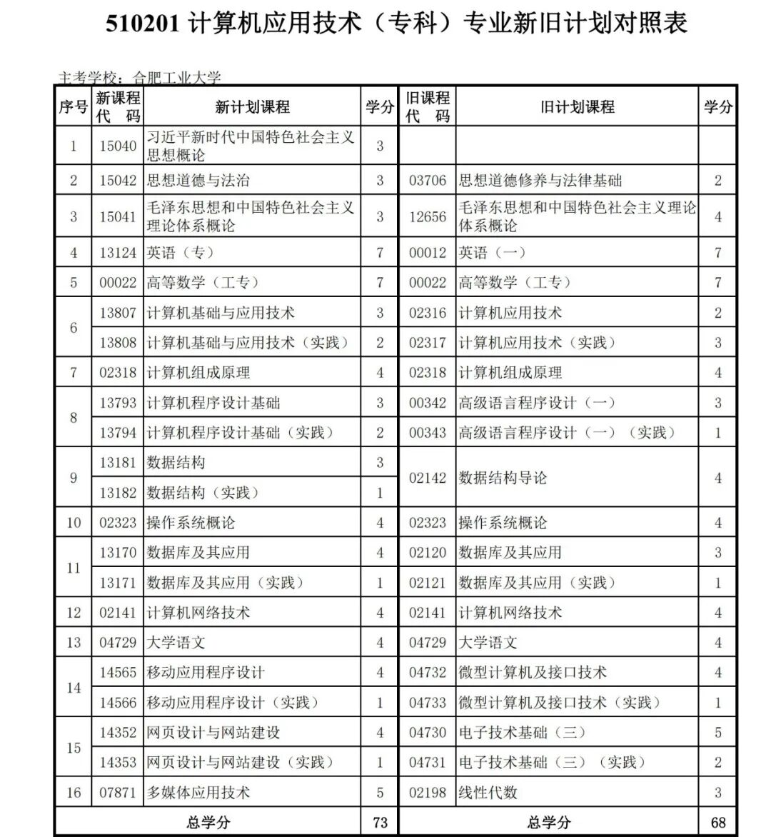 安徽省自学考试新旧考试计划对照表2026版